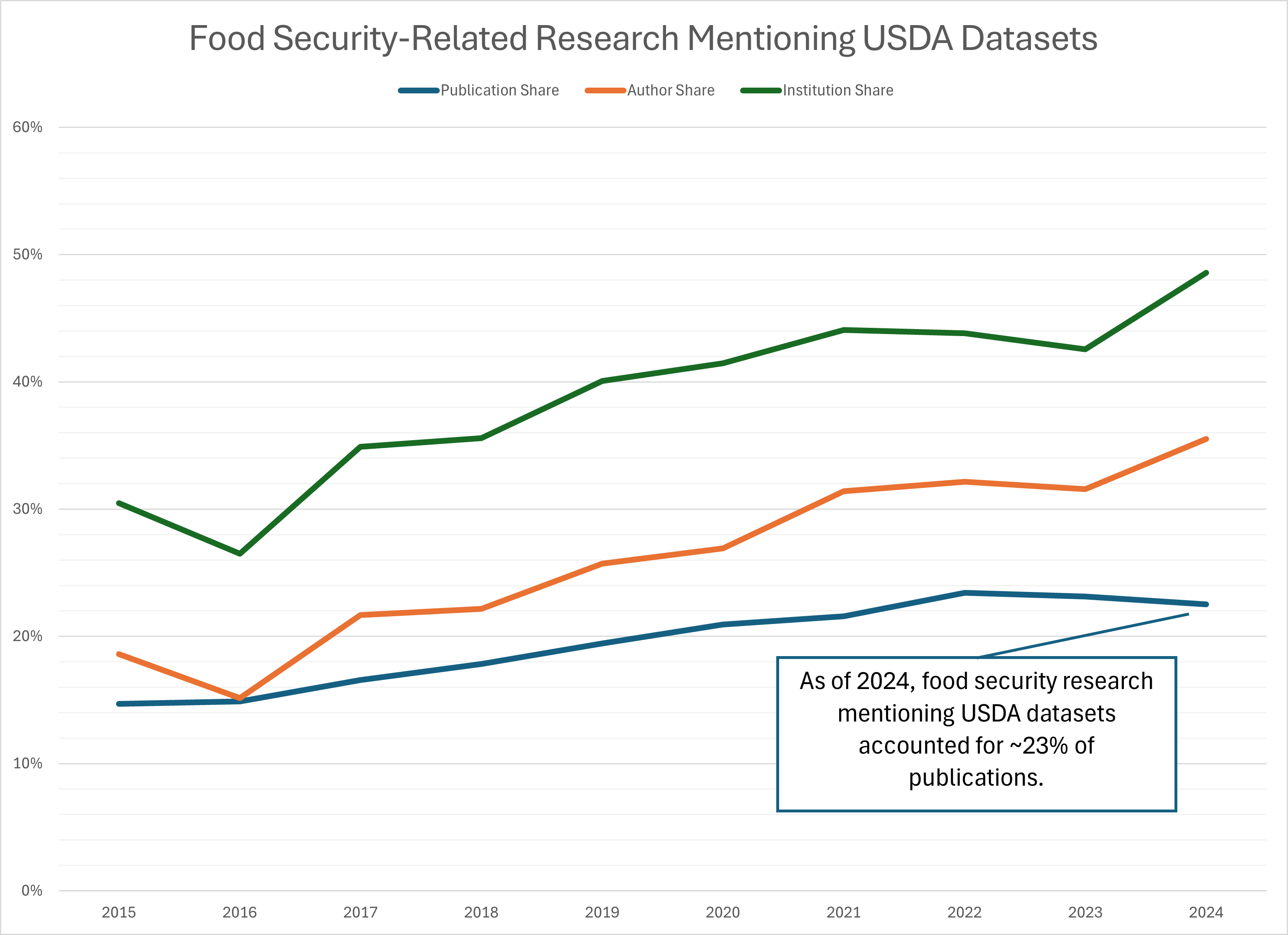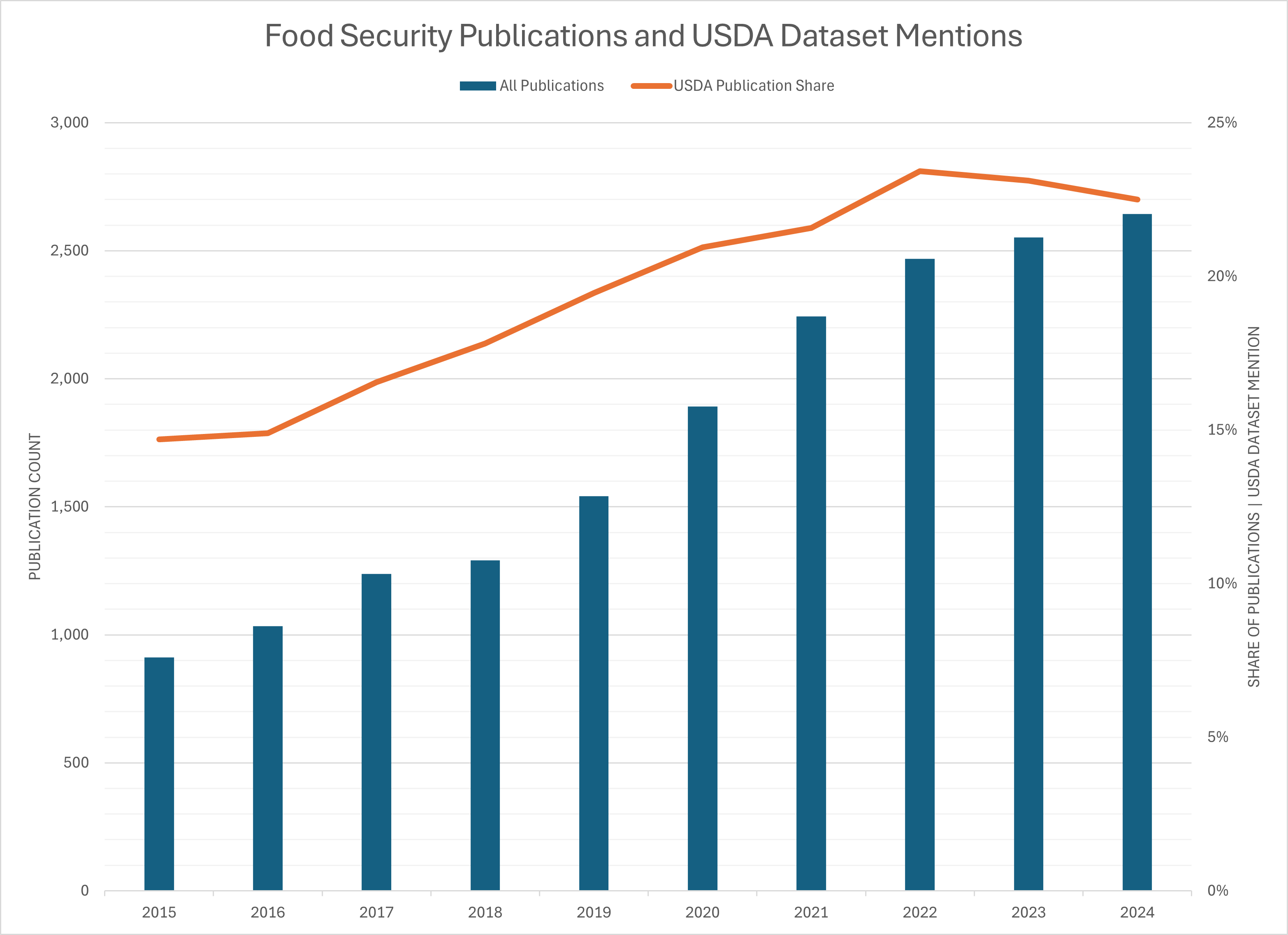 But as we’ll see next, the volume of food security publications continues to grow while USDA dataset mentions have plateaued.