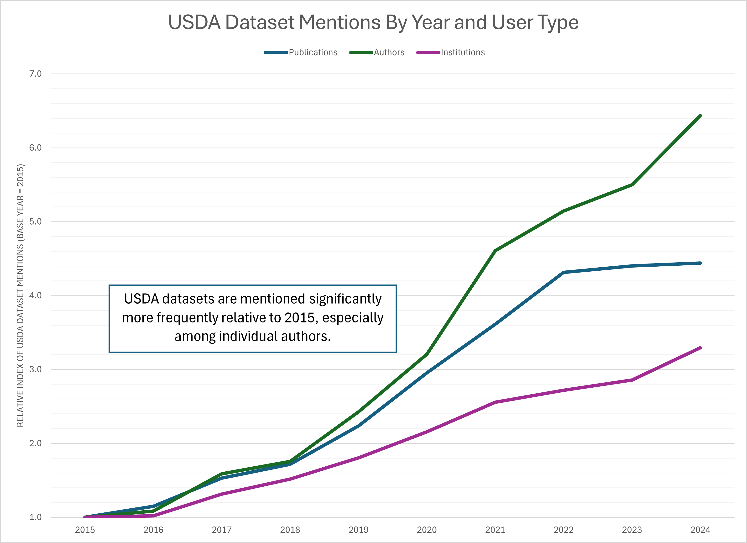 This figure plots an index of unique publications, authors, or institutions mentioning the selected USDA datasets from 2015-2024, where 2015 is the base year (index = 1). For example, there were 595 publications in 2024 and 134 in 2015, so the index is 595 / 134 = 4.44.